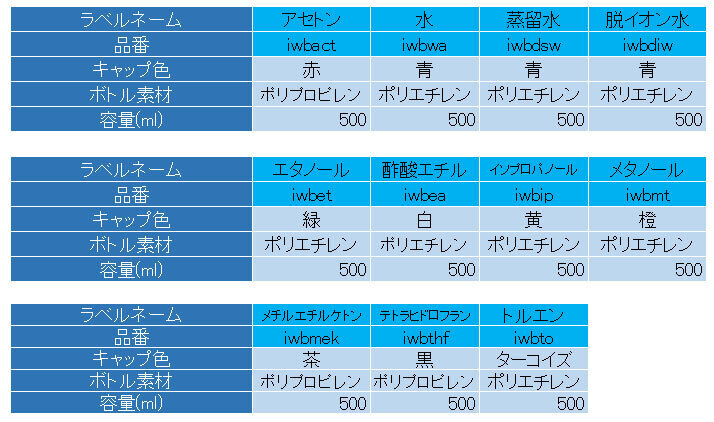 容易に内容物の識別を可能にする化学名・化学式・CAS番号の表示および色分けがされています。